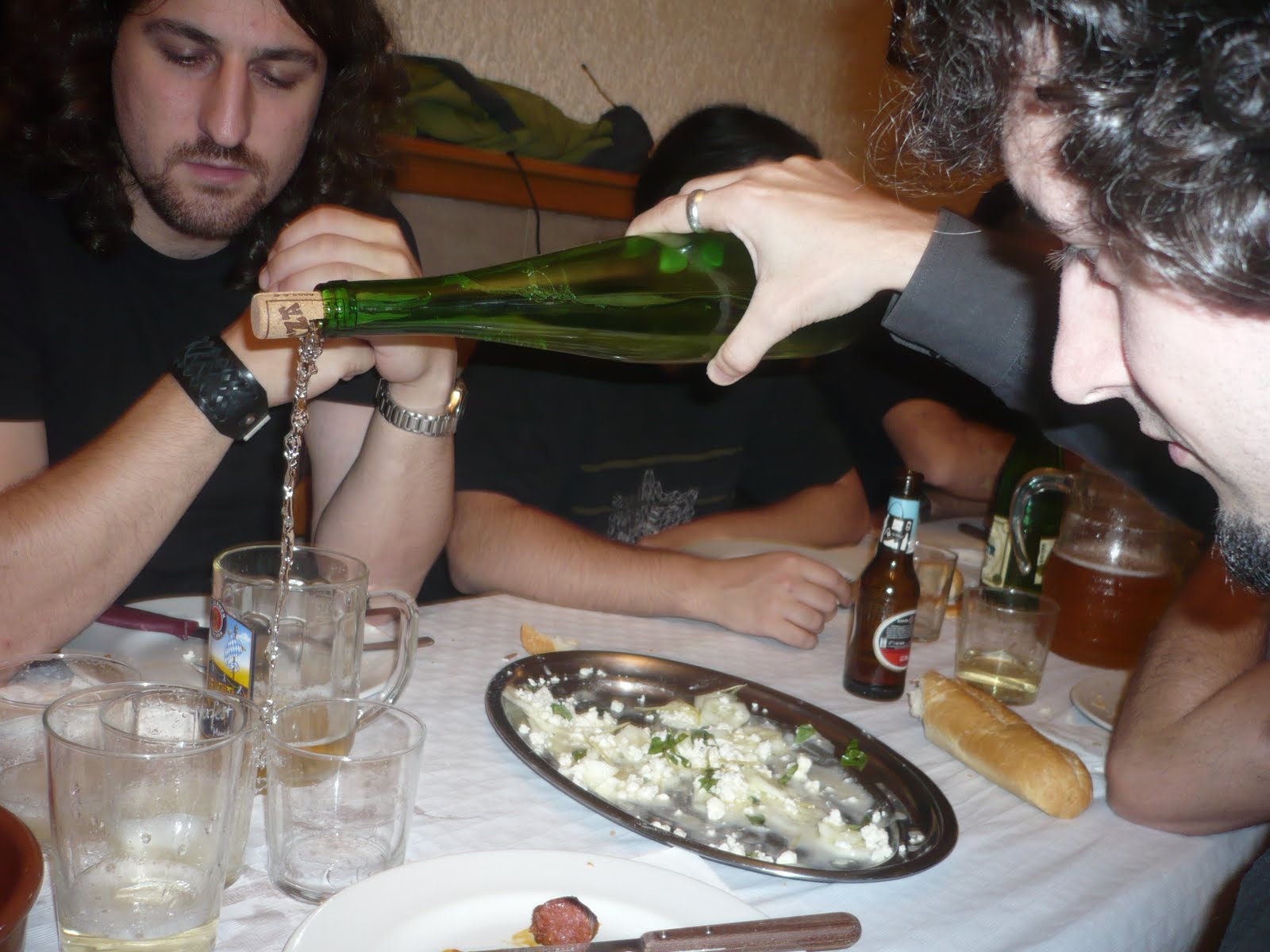 Buena cena, cerveza y más sidra y txakoli ¿qué más se puede pedir? Bueno, claro, y la demostración de que la técnica vasca y la navarra de perforar corchos para escanciar bien la sidra es similar.